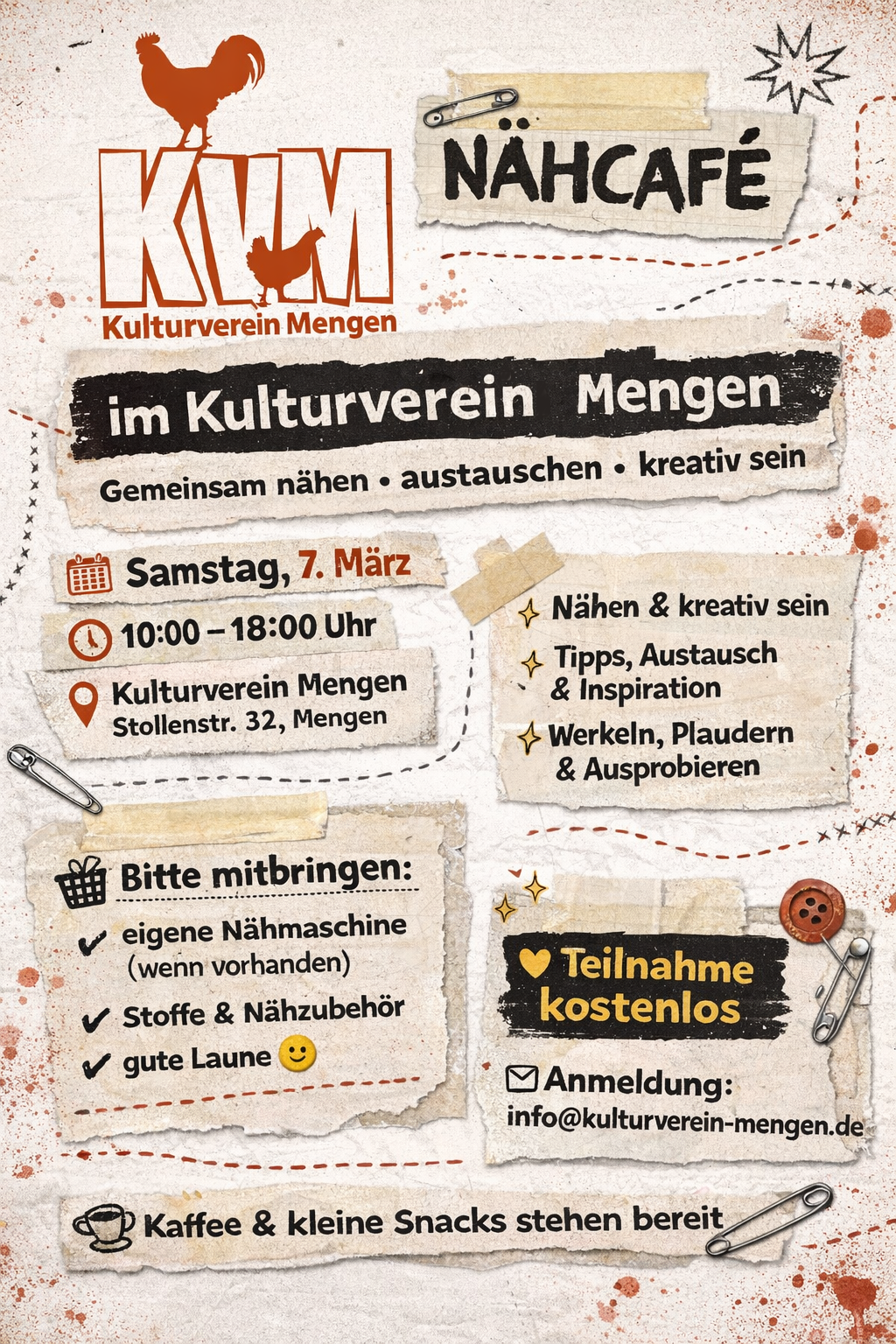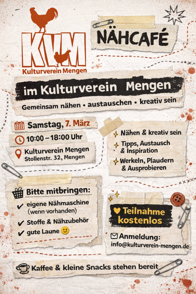 Jeder bringt eine Nähmaschine mit und wir nähen zusammen z.B. einen Bademantel, Hose, Schürze… oder es werden einfach Klamotten geflickt…